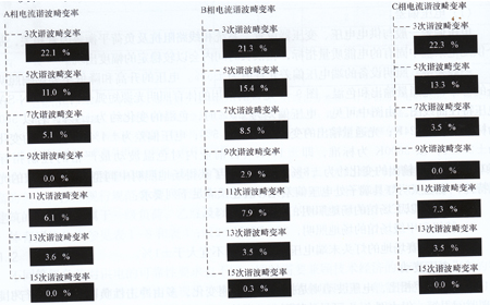 3)諧波抑制。對于照明末端負荷為單相負荷的,產(chǎn)生的諧波多為3次諧波。圖9-2為水利方體育照明回路中的諧波含量。如果體育照明的供電電源中包括蓄電池類電源裝置,則諧波含量還會增加。圖中可以看出,三相上3次諧波含量最多,均在21%以上;其次是5次諧波,在11%以上;11次諧波局第三位,達6%以上;7次和13次諧波含量也不少,均在3%以上;9次和15次諧波含量較少,尤其15諧波可以忽略不計。