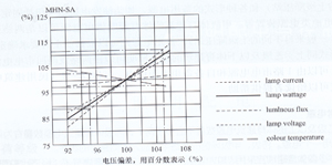 一般來講,照明設備的端電壓偏差允許值為±5%。電壓的升高和降低主要影響照明設備的壽命、光通量輸出和色溫。圖9-1是目前常用的體育照明光源短弧金鹵燈MHN-SA的電壓特性曲線圖。由圖中可見,電壓偏差為±5%時,色溫的變化約為±4%,若以5600K為標準,即±224K;光通量輸出的變化約為±12.5%;電壓偏差為±4%時,色溫的變化約為±2.5%,以5600K為標準,即±140K(目前業(yè)內(nèi)對色溫波動最嚴格的控制指標是150K),光通量輸出的變化約為±8%因此,為了獲得場地照明中同型號燈具一致的光輸出特征,場地照明燈具端子處電壓偏差允許值建議滿足下列要求: