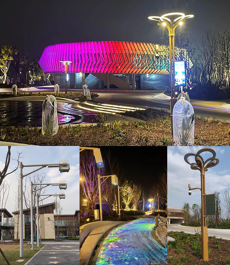 ”智慧城市,智慧照明“在項(xiàng)目中亦多處使用,功能照明上,各地塊均使用非標(biāo)定制的智慧燈桿,實(shí)現(xiàn)園區(qū)監(jiān)控、信息投播、語音廣播、功能照明、WiFi傳播、一鍵報(bào)警等一體化智慧科技,智能城市系統(tǒng)化。