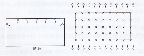 (1)頂部布燈方式。頂部布燈方式即單個燈具均勻布置在運動場地上空,宜選用對稱型配光的燈具,適用于主要利用低空間,對地面水平照度均勻度要求較高,且無電視轉播要求的體育館。燈具的布置平面應延伸出場地一定距離,用以提高場地水平照度均勻度,見下圖。