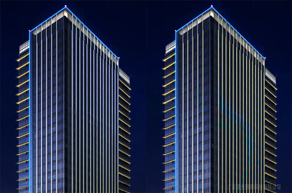 頂部半透明玻璃遮陽板后面投射燈光,營造發(fā)光效果;利用豎向鋁板線條鋪設燈光,燈光可電腦操控,可預設多種圖案;裙樓在樓板之間加燈光,要求發(fā)光亮度高。