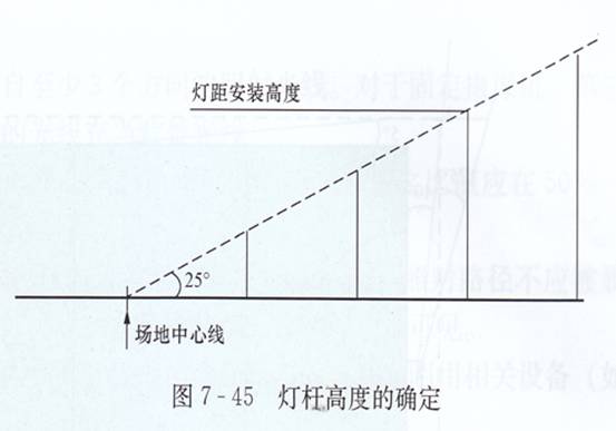 燈桿的高度除與燈具的瞄準(zhǔn)角有關(guān),還與燈具到場(chǎng)地的距離有關(guān)。燈桿離場(chǎng)地越遠(yuǎn),燈桿就越高。圖7-45描述了它們之間的關(guān)系。