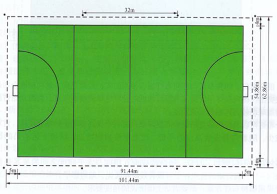 曲棍球場(chǎng)地四周設(shè)有無(wú)障礙區(qū),在障礙區(qū)域內(nèi)絕對(duì)不允許裝設(shè)燈桿,燈塔。無(wú)障礙區(qū)域最小為:距兩底線5m,距兩邊線4m。