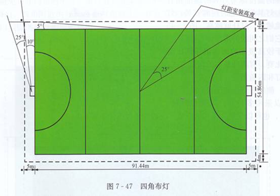 如圖7-47所示,燈具安裝在曲棍球場(chǎng)四角的燈桿或燈塔上。