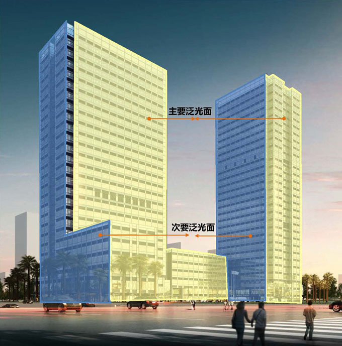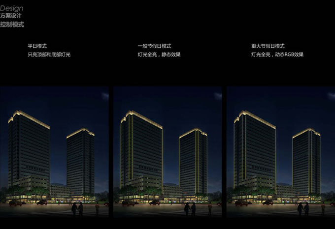 根據(jù)本案各個方向視點分析結(jié)論,把握建筑空間主次關(guān)系,掌握照明的注重點。本案的臨街面和面對南站面為主要泛光面,可著重表現(xiàn),根據(jù)尺度空間的關(guān)系,應(yīng)注重不同尺度對周邊的泛光影響。