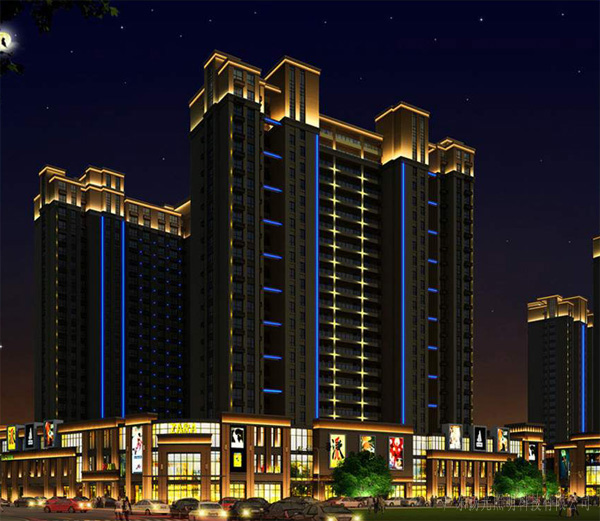 建筑的頂部與底部燈光,突出清晰明亮的建筑遠景視覺效果,提升建筑夜晚對外的吸引力。