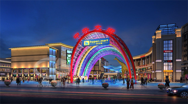 中央大街主入口——采用RGB全彩的投光燈,整體投亮入口拱門,夜晚燈光七彩變換,似絢爛的彩虹,視覺效果十分吸引眼球,給人們一種過目不忘的感覺。