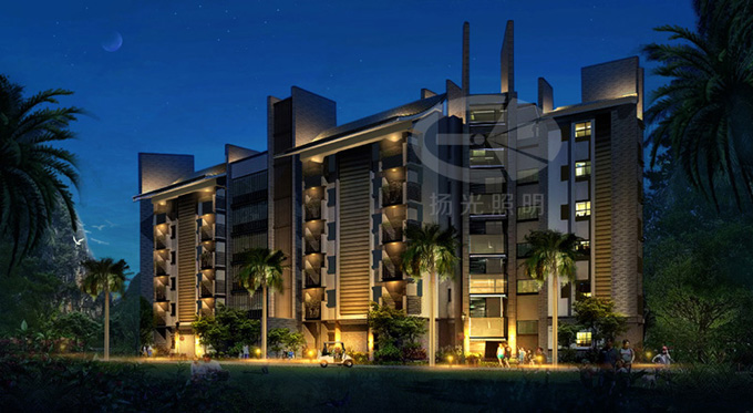 住宅燈光以靜謐的燈光氛圍為主,充分結(jié)合建筑特色,運(yùn)用“點(diǎn)線面”燈光手法,強(qiáng)調(diào)建筑夜景特色。重點(diǎn)交代建筑頂部與入口在夜間的主次關(guān)系。